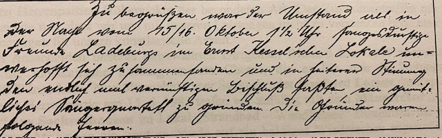 „Zu begrüßen war der Umstand als in der Nacht vom 15/16. Oktober 1 ½ Uhr sangesdurstige Freunde Ladeburgs im Ernst Kesselschen Lokale unverhofft sich zusammenfanden und in heiterer Stimmung den endlich und vernünftigen Beschluß faßten, ein gemütliches Sängerquartett zu gründen. Die Gründer waren folgende Herren: 1. Karl Bielicke, 2. Waldemar Kaiser, 3. Ernst Kessel, 4. Richard Lier, 5.Walter Papke, 6. Richard Schiefelbein“