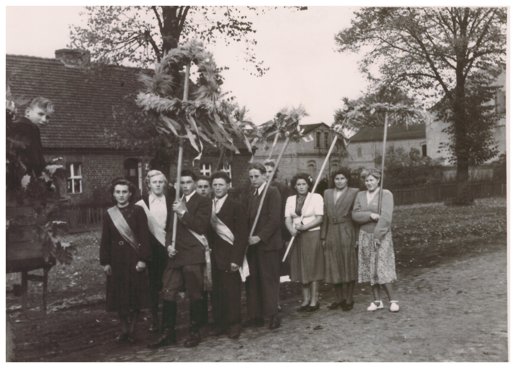 Eine mit Blumen und bunten Bändern geschmückte Erntekrone, herausgeputzte Harken und Pferdewagen führten den Zug der jungen Leute durchs Dorf an und abends spielte eine Kapelle zum Tanz auf.
